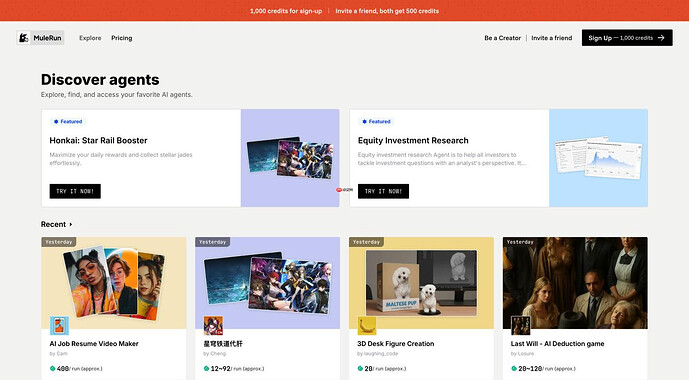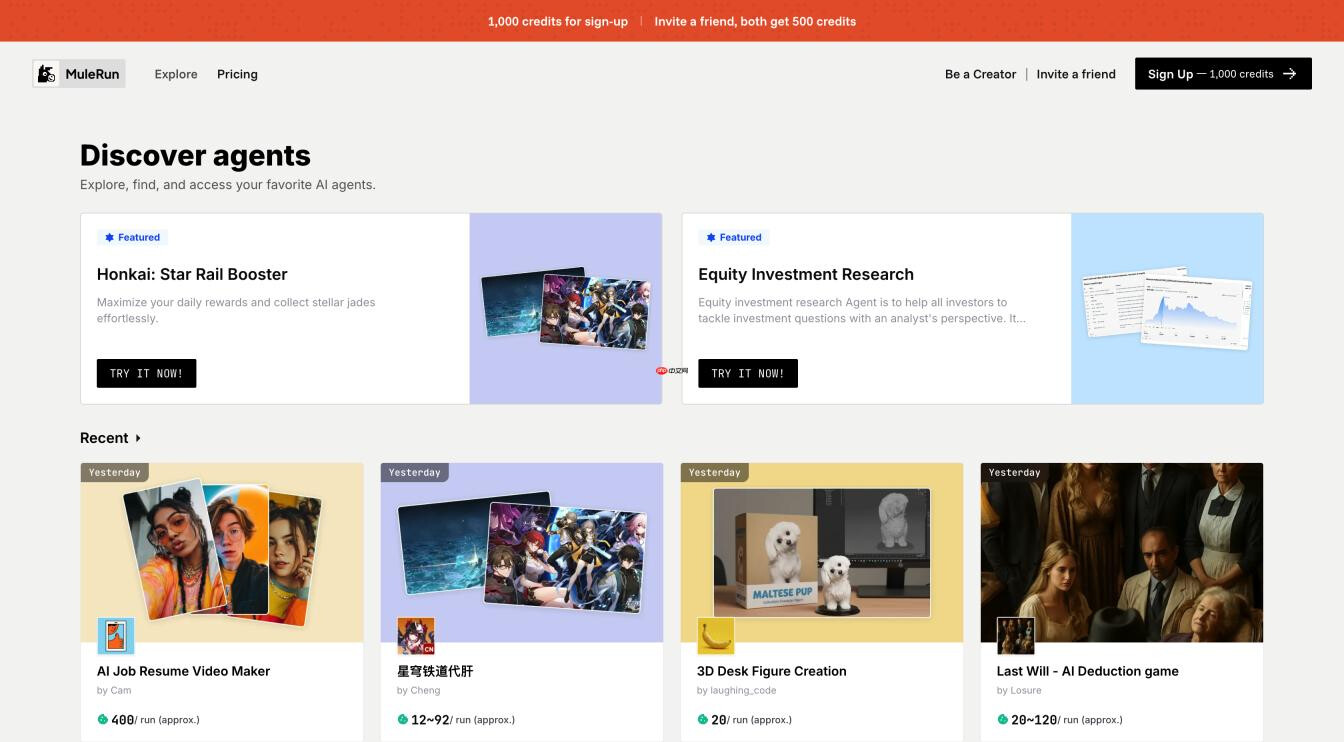 图1:MuleRun官网首页,展示推荐Agent和注册入口