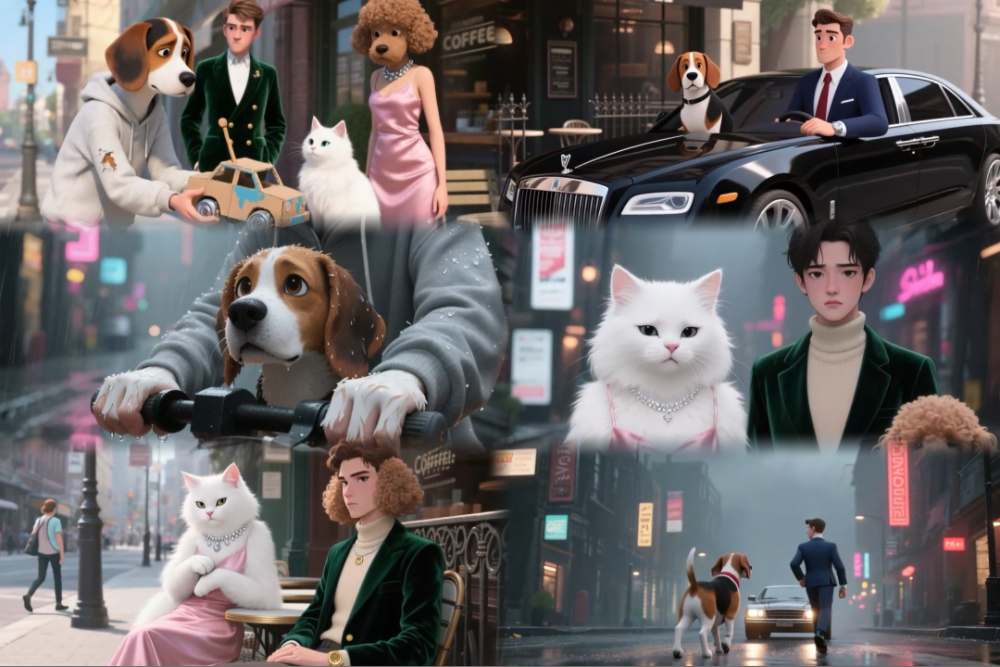 - 上传图片或文字生成角色,AI确保多镜头下形象不变(如“穿汉服的小猫杜甫”贯穿全片)。